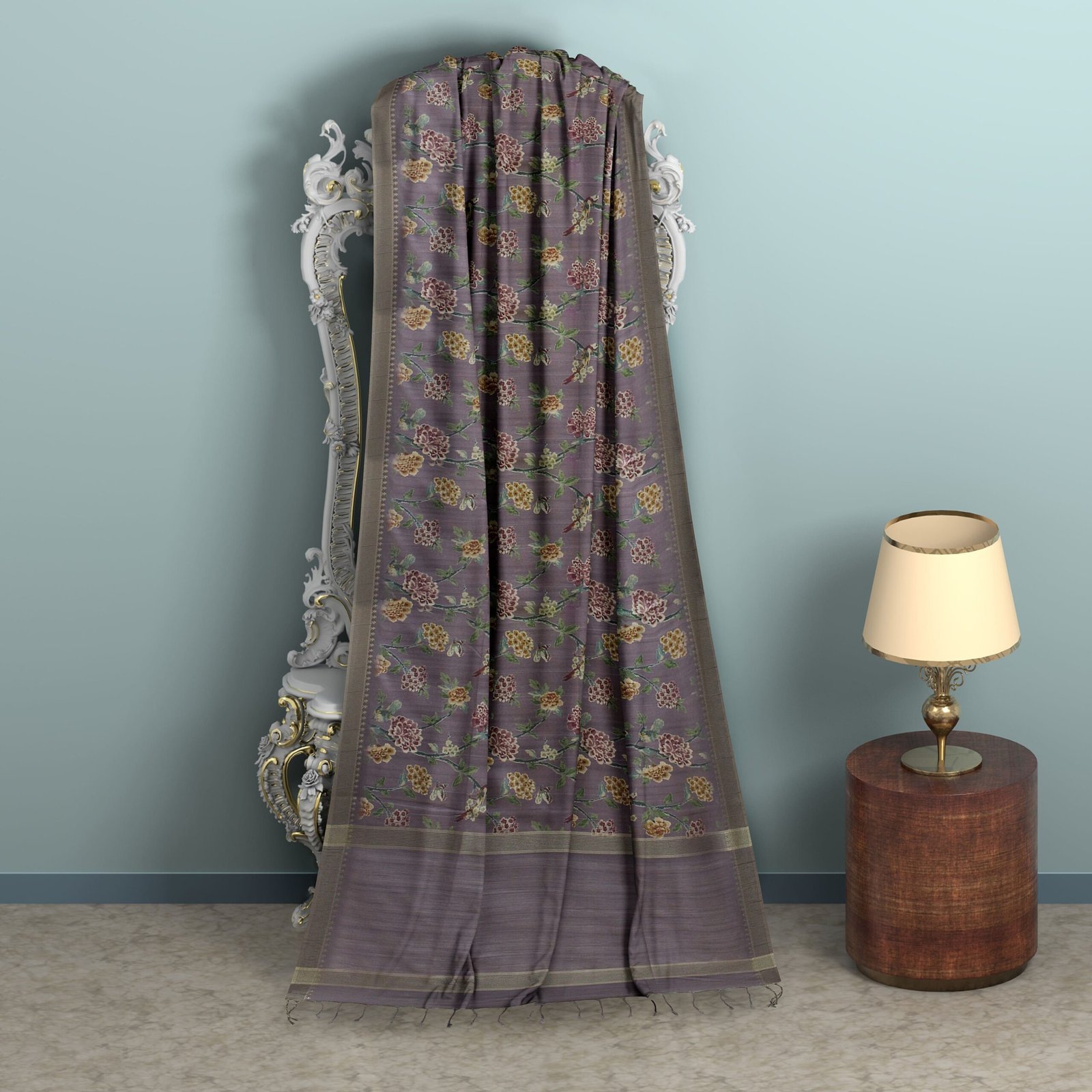 Step into timeless style with this gorgeous grey-purple floral saree, a perfect blend of tradition and contemporary design. Crafted from a high-quality Silk blend, this saree is incredibly soft, breathable, and lightweight, ensuring maximum comfort even during extended wear. The all-over floral print, with its vibrant mix of meroon, yellow, and green hues, adds a charming and artistic touch, making you stand out in any crowd.